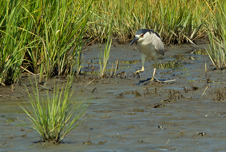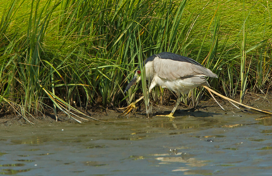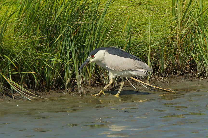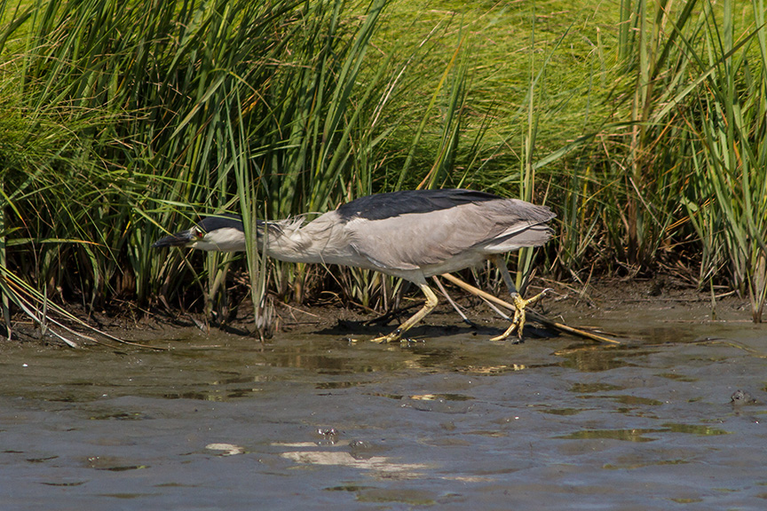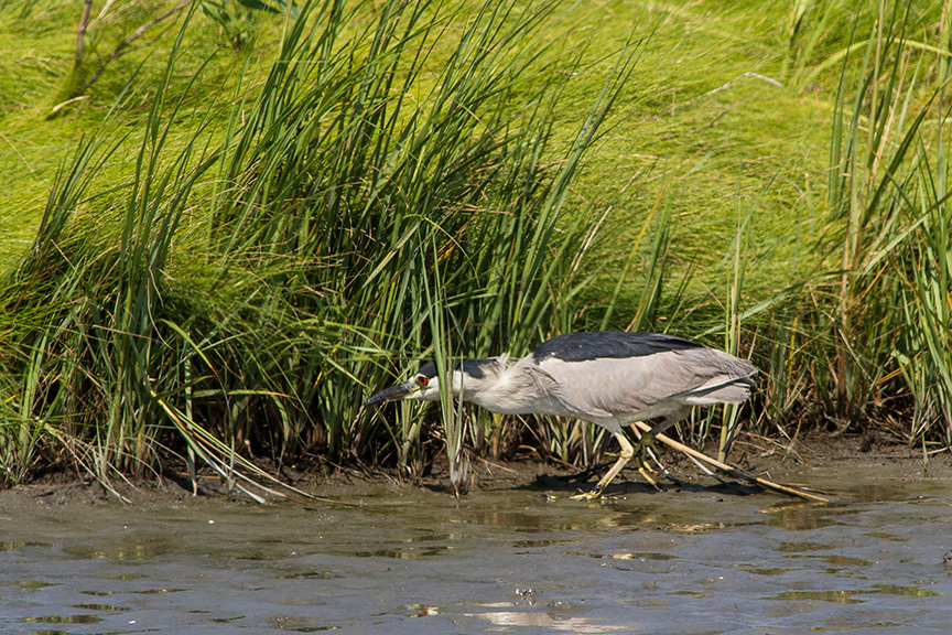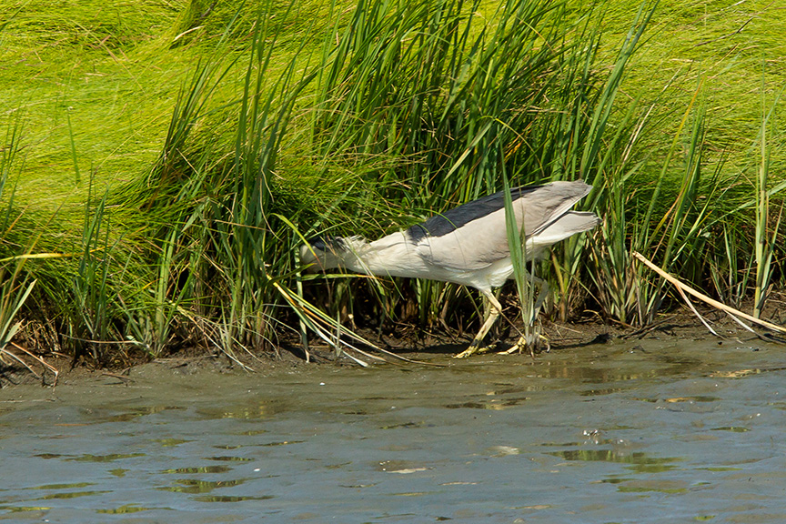 It is fun to watch a Black-crowned Night-heron foraging for a meal along the shoreline. After coming out of cover from the thick grasses it was stalking the shoreline. Then stopped when it thought it found something. Then little by little they inch forward and freeze waiting for the moment to strike. In this sequence it was frozen for quite a few minutes and seemed like a statue before realizing, I guess, there was nothing there and then returned to its cover in the grasses. I was shooting all along this hoping to get an action shot of it getting its meal, but all I have is pretty much the same shot through the sequence before it returned to where it came out.