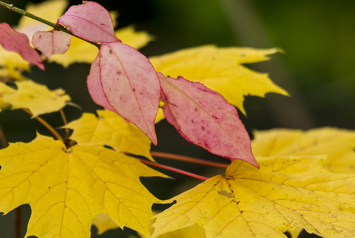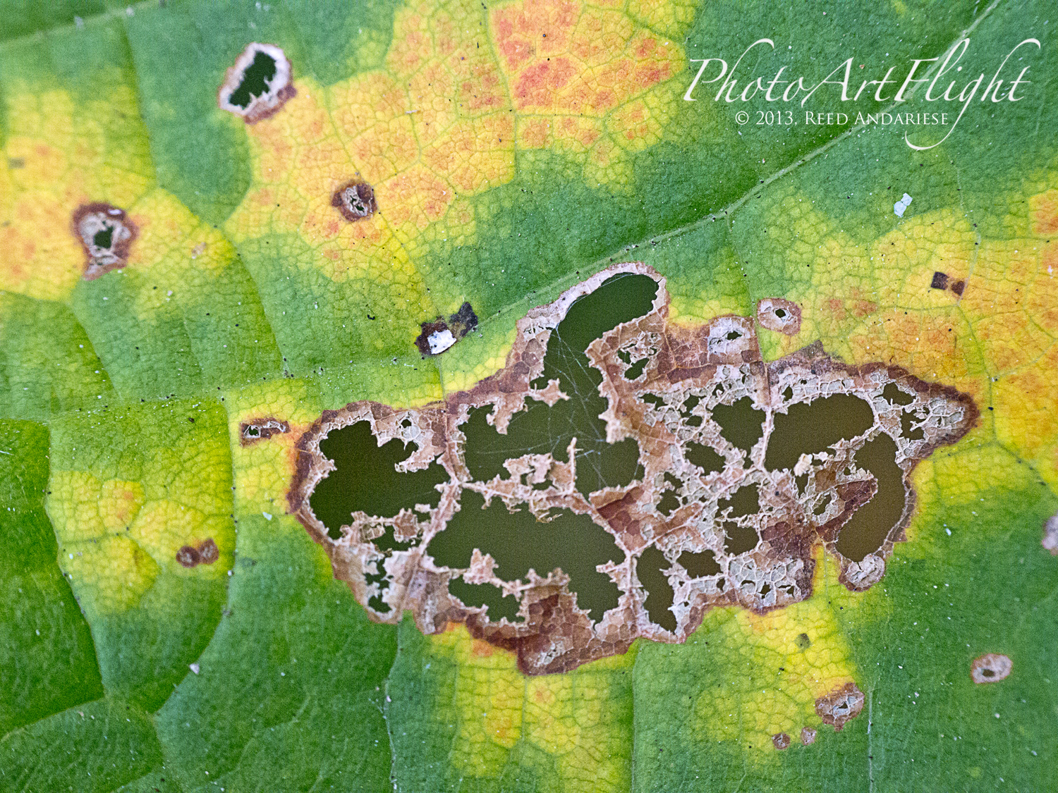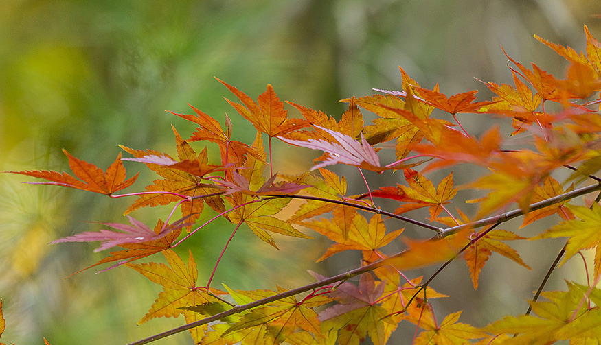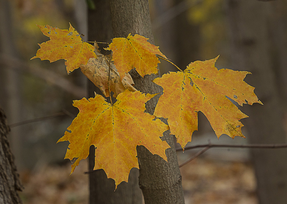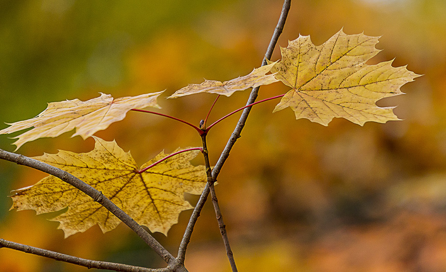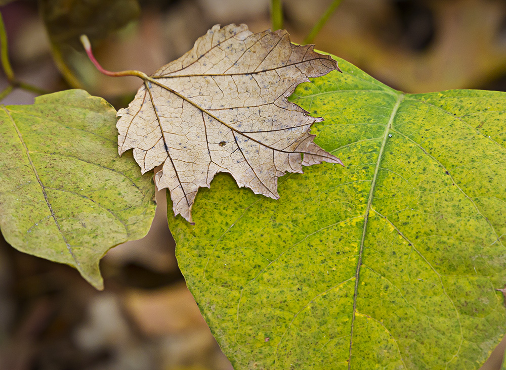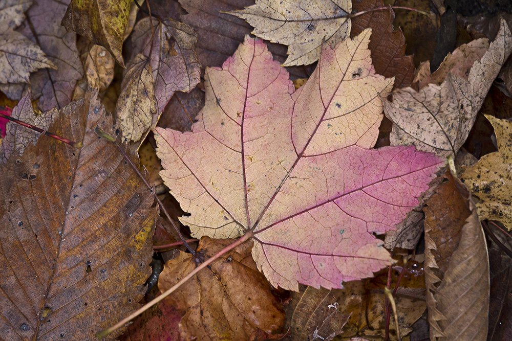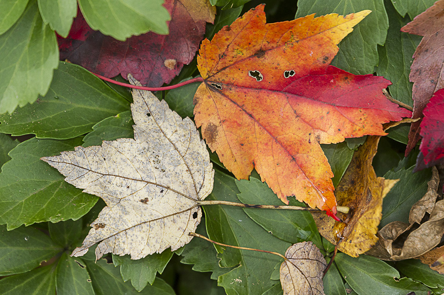With all the leaves starting to turn color, I thought I would try some extreme closeups of leaf details. I could use a standard macro, or a Canon MP-E 65mm 1-5X macro, but I decided to try something different. I mounted an old FD Canon manual focus 50mm f/1.8 lens with a m43 adapter on my Panasonic GH2. Then I added an achromatic closeup lens. An Achromatic lens or achromat is a lens that is designed to limit the effects of chromatic and spherical aberration, which limits distortion. It is basically like a closeup filter to get closer to your subject. You do not need extension tubes, You use them like a filter on the front of the lens. You can get very inexpensive ones, which are usually one piece of glass to very good ones with multiple pieces of glass. They range in price from $15 to thousands of dollars, but you can get good ones from Canon, Nikon or Raynox for a reasonable price. I have many different kinds that I have collected over the years, but used a set here with 3 different strengths, 6X, 12X & 24X. These just screw into an adjustable mount that clips onto the front of the lens. Just be careful to get as parallel to your subject as you can. The leaves were blowing in the wind, so I tried to capture the images in-between gusts. Here are a series of images using all three. So give it a try, they are handy to have in a pocket when you need them, without the weight and size of having a macro lens with you. Do they replace a macro lens? No, but come in handy, especially for some extreme closeups.