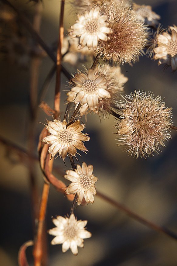Larger Dried Wildflower @ 1.3X, handheld, lit with ring flash for main exposure, ambient light for background 1/10 of a second
