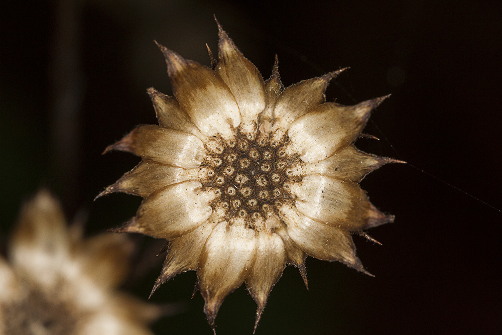 One of the smaller dried wildflowers @ 1.3X, lit with ring lash, no ambient light, for darker background