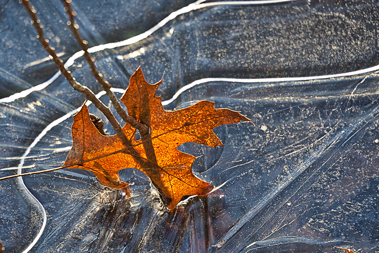 Going over files from last year and found this one. When the weather starts getting colder, I like looking for interesting ice patterns in streams or along lakes and hopefully with an item in the composition for a focal point. I found this leaf stuck in a small twig above this ice formation. I liked the early morning low sun backlighting the leaf, adding warmth, highlighting textures & patterns in the ice. Photographed with a Canon Eos 1D MkIII with a Canon 70-300mm f/4.5-5.6 DO IS USM @ 300mm, 1/100 @ f/8, ISO 400. I also used High Pass Sharpening in Photoshop to help bring out details & textures in the ice and leaf.