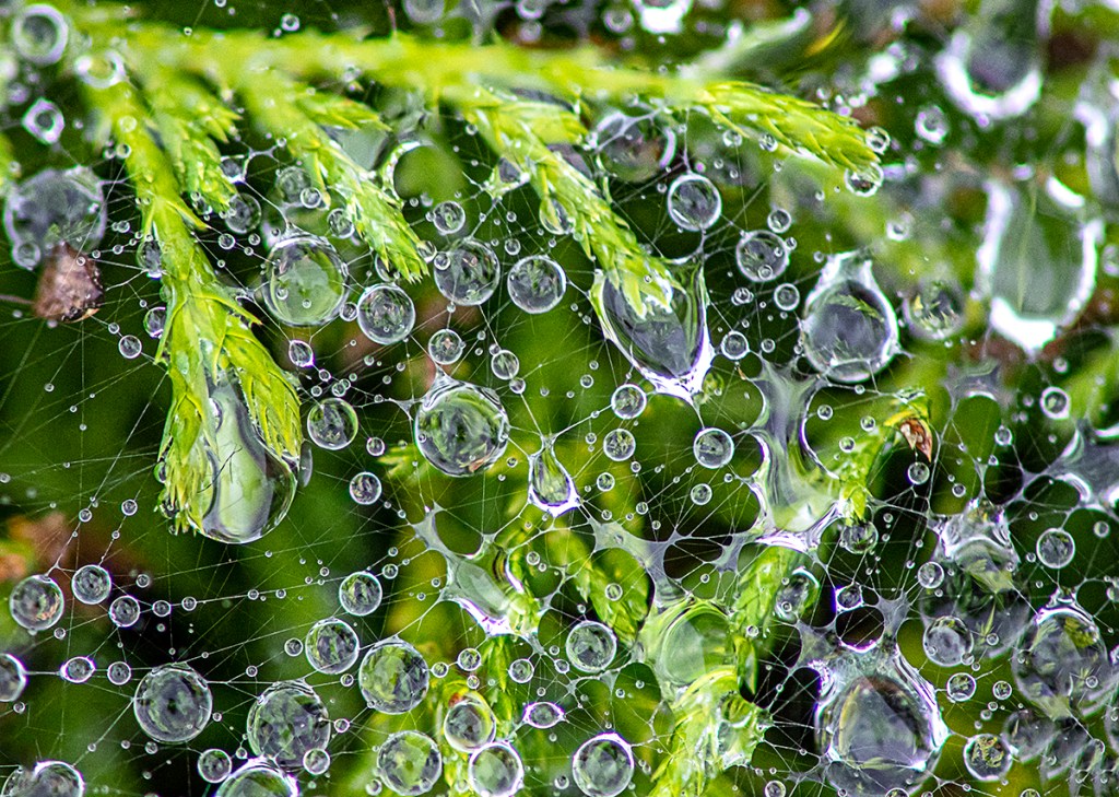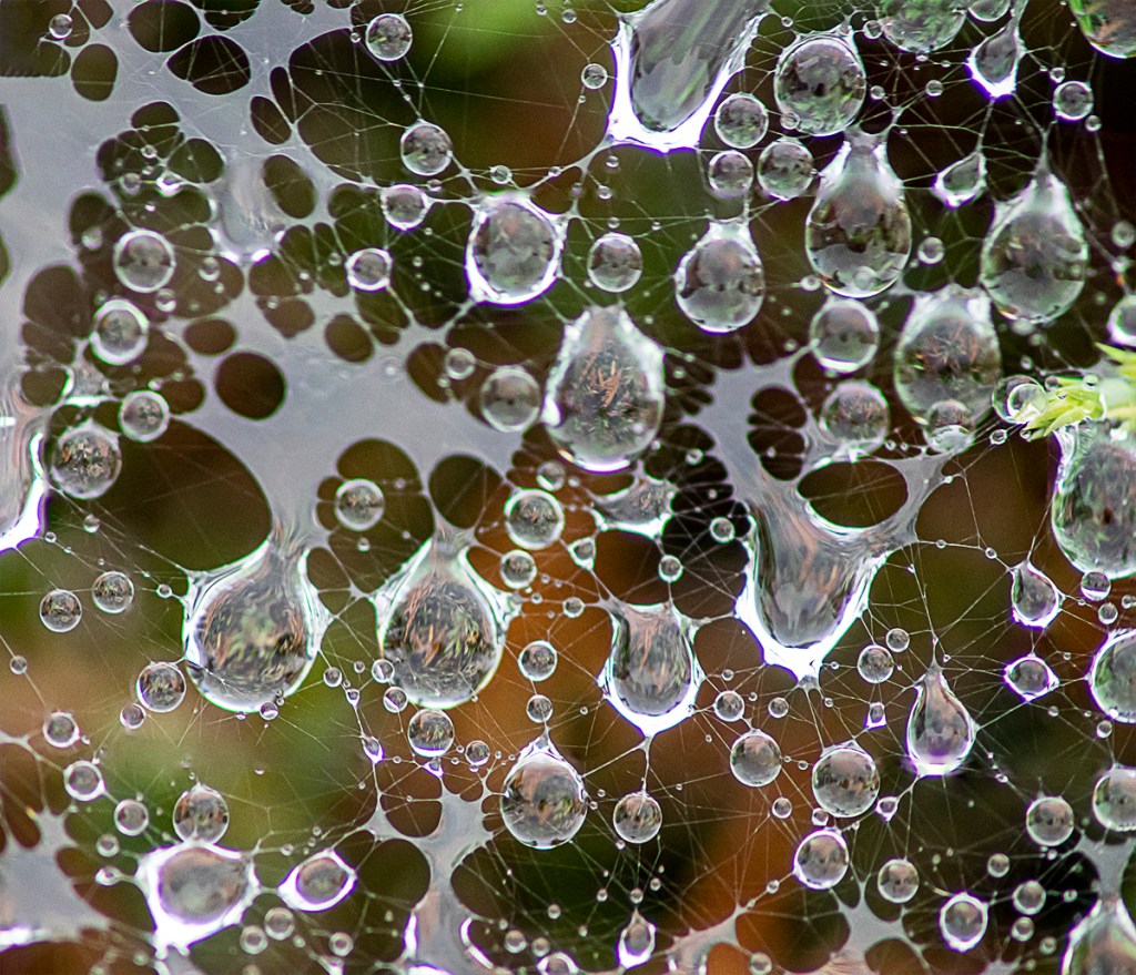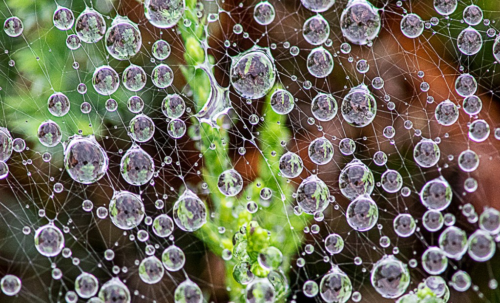 After a rainstorm it is fun to go out and see what interesting raindrop images you can find. These raindrops were on webs which added some interest and patterns to the raindrops. All images here were taken with an Olympus OM-D E-M1 with an old Canon FD manual focus 200mm macro lens. With adapters you can fit a wide variety of old lenses to m43 cameras. FOV (Field Of View) to full frame Cameras is equal to 400mm.