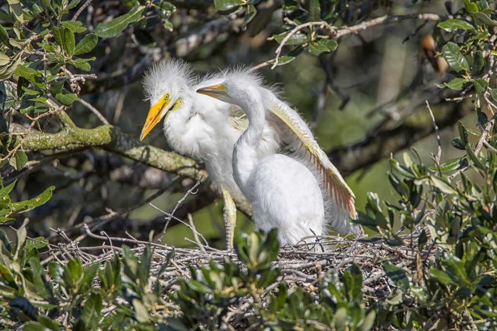 The featured image shows a little older set of young Great Egrets. They were just hanging out at the nest waiting for food for when their parents return. Below are a few other Great Egret nests with younger birds showing their “fuzzy” look. The images were shot at 550mm and 600mm.