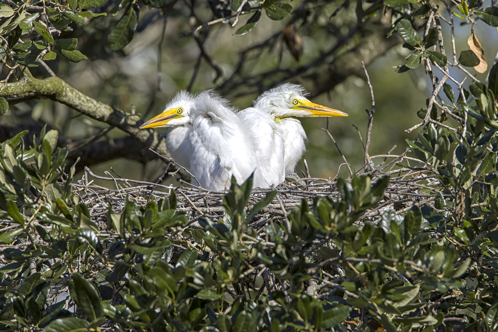 The featured image shows a little older set of young Great Egrets. They were just hanging out at the nest waiting for food for when their parents return. Below are a few other Great Egret nests with younger birds showing their “fuzzy” look. The images were shot at 550mm and 600mm.
