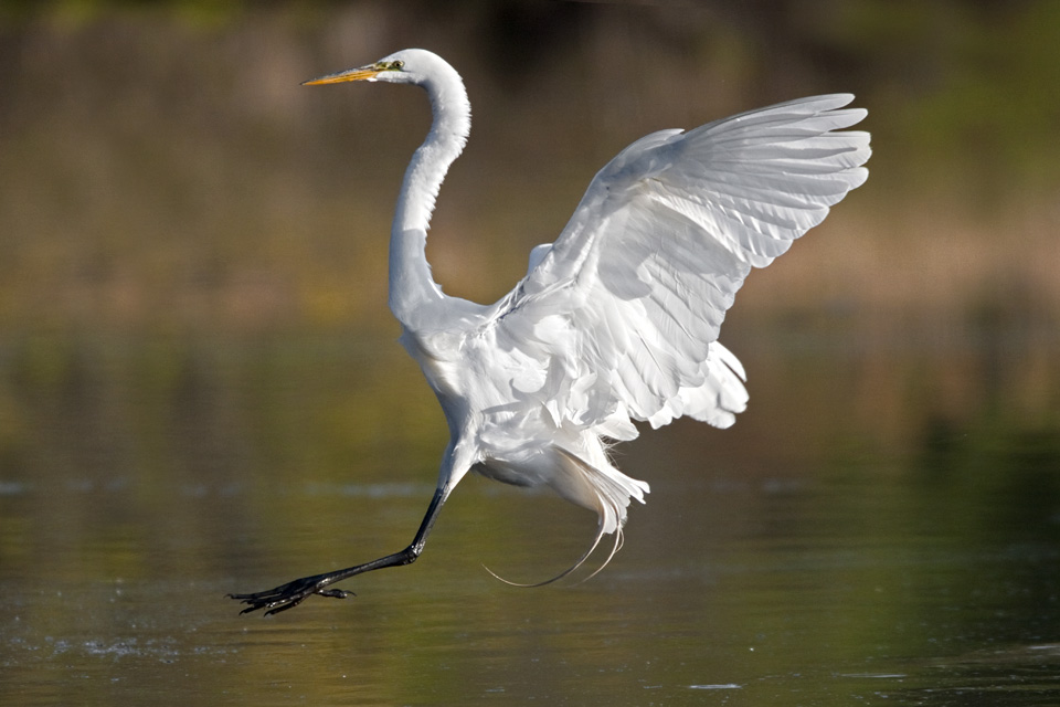 A Great Egret landing in the early morning light at a small local lake. Image taken with 400mm DO lens with 1.4X teleconverter.