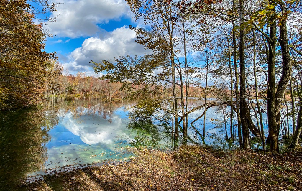 On our recent walk at Plainsboro Preserve, we took a different trail that took us to the farthest viewing point of McCormack Lake. We had never been at this spot in the woods before. There were many trees in the way, but I liked the view looking through the trees seeing the distant shoreline with the trees & clouds across the Lake. I was using a Canon R with a 12-24mm lens, but for this post I am only using the images I shot with my iPhone 11. Most of these iPhone images are multi-image shots to get wider views or a little taller views to get more foreground & more of the clouds. The featured image is 4- iPhone 11 Pro images with the 1.5mm lens to get more width and more sky & foreground. On a Full Frame camera this would be approximately equivalent to a 13mm lens field of view.