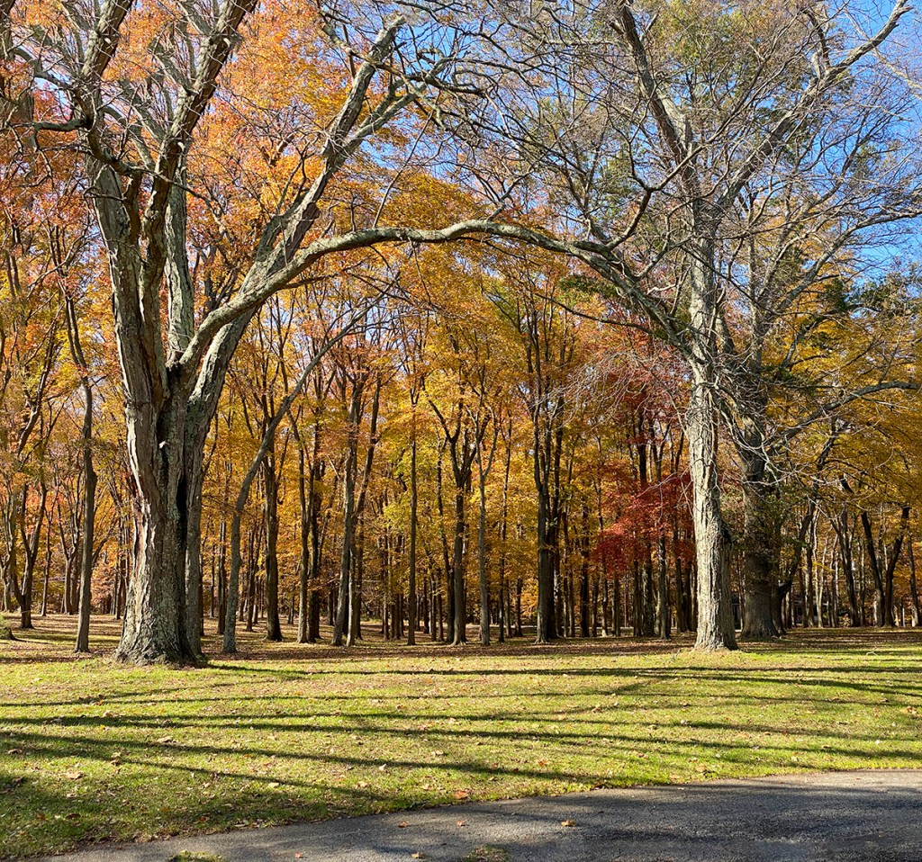 We went for a walk at a local park in our town to see what we could find to photograph. We usually do not go there because it is a very crowded, but large park with 675 acres. The Park also has lots of sports fields, basketball courts, etc. The park features Manalapan Lake, a 30 acre lake periodically stocked with fish by the State Division of Fish and Wildlife. The Lake is not photogenic because of Buildings & Businesses across the Lake in the background. But some of the wooded areas were interesting with what was left of the Fall Colors in the trees. Plus it was a nice sunny day with blue skies behind the trees. I was traveling light and was just using my iPhone 11 Pro. When shooting panoramas with the iPhone, I do not use the panorama feature built in the iPhone because of the very small lenses in the iPhone – 1.5mm, 4..3mm & 6mm lenses (Plus Digital Zoom feature up to 10X). Using the Panorama feature tends to distort the ends of the panorama and give a “bulging effect ” in the middle of the image. Even with the wide 1.5mm lens (Full Frame Equivalent is ~13mm) I tend to like a wider view. Shooting multiple single images and combining them in Photoshop minimizes this “Bowing” effect and I can get any length image I want. The Featured Image was a 3 image panorama shot using the 1.5mm lens (Full Frame Field of View Equivalent ~13mm). The images for each Multi-Image were loaded into layers in 1 Photoshop file. Then I used Auto-Align to align the images. Then used Auto-Blend to blend the multi-images for the final image.