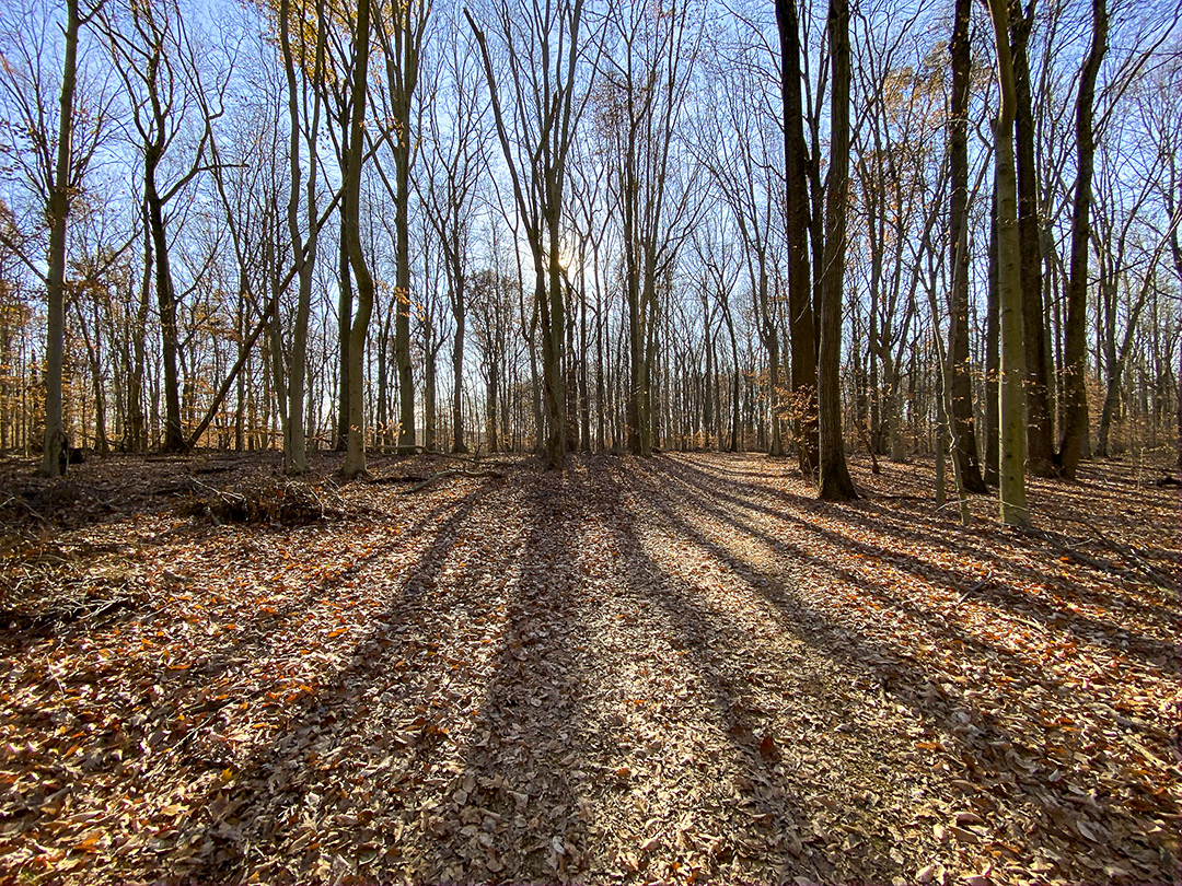 We took a walk through the woods at a local park just to get some fresh air. I only had my iPhone 11 Pro with me since I was not thinking anything would be interesting to photograph. The sun was low and most of the leaves were off the trees, but the shadows of the trees were amazing. The iPhone did a nice job photographing in a variety of lighting conditions. After getting use to the new iPhone for a while now, I tend not to use the pano mode as much, preferring to shoot multiple images to assemble my own wider or panorama views. Even with the 1.5mm lens selected (Full Frame Equivalent 13mm), I want more width without more height. On this walk I had enabled the phone to shoot HEIC Raw files instead of jpeg files. This way I supposedly had true Raw Data to work with in Adobe Bridge before opening in Photoshop instead of enabling Adobe Camera Raw to open jpegs as Raw files with settings. Also for certain scenes I like using the 16:9 capture mode setting for longer scenes without using the 4:3 usual capture. The 16:9 does not work with the 1.5mm lens.