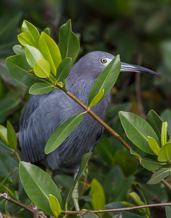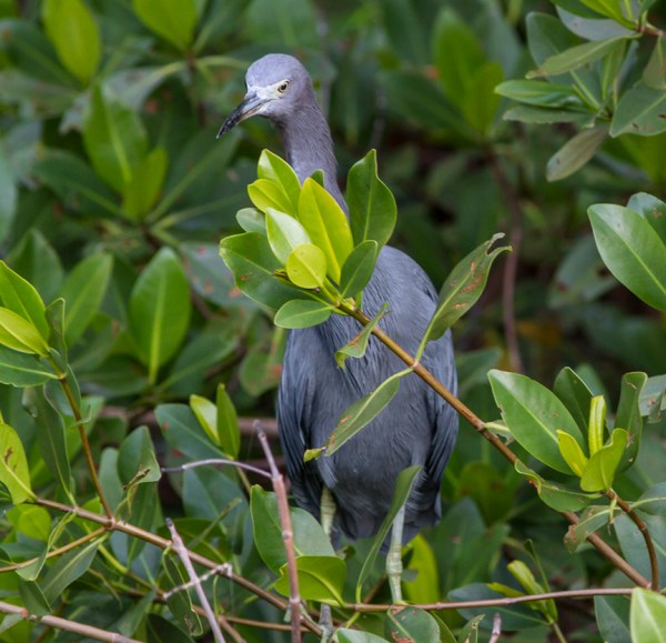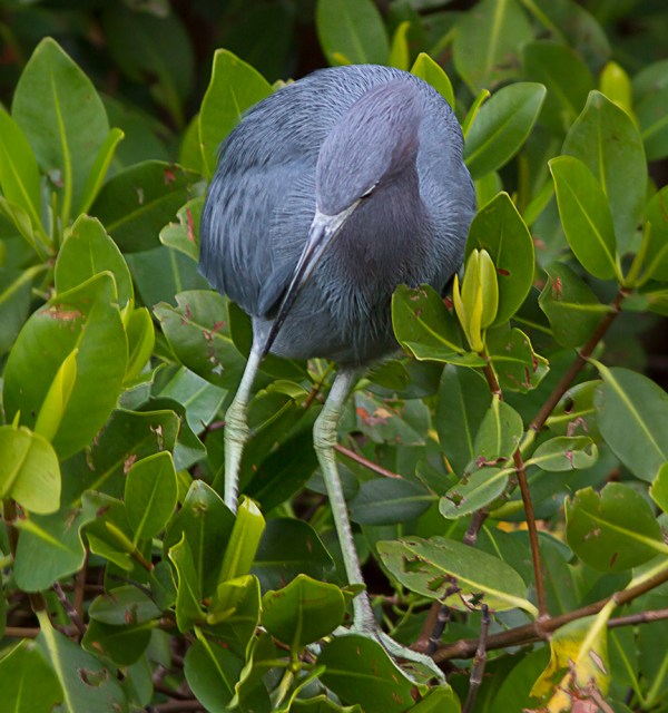 Here are some more photos of the Little Blue Heron from a previous post. It was early in the morning with not many subjects to photograph. I came upon this Little Blue along the Wildlife Drive. It was working it’s way through the bushes, above the water. The trees were blocking the sun, so it was fairly dark, so I shot a series of bursts hoping to get a sharper image in one of them. Being in the shade, I was shooting at 1/50 sec at ISO 800, handheld. I do not like raising the ISO on this camera above that, so I got what I could.