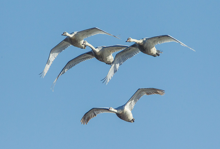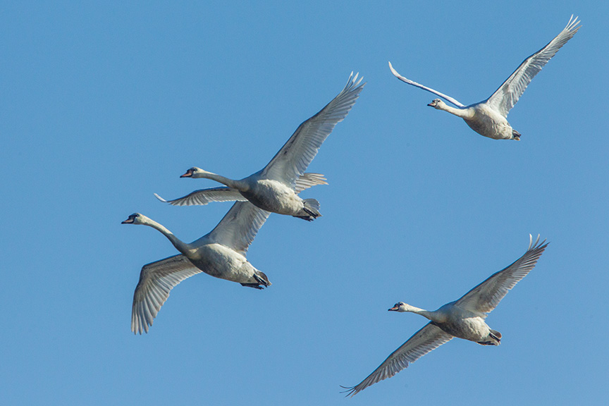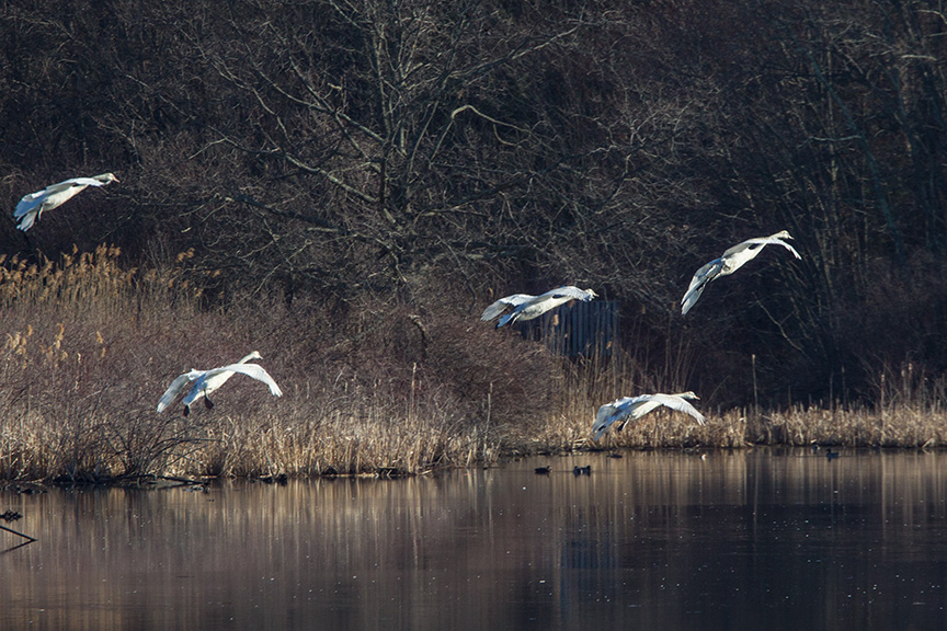 I went to the local Nature Preserve this morning hoping to see an Osprey and maybe a few different ducks. Saw an Osprey across the lake but it flew off into the distance. A Great Egret flew in and landed on a close pile of sticks in the water and I was concentrating on the Egret when suddenly 6 Mute Swans flew in & did a close Fly By then landed on the far side of the lake. Mute Swans are one of my favorites. Their wingbeats sound cool as they fly by, especially when there are six of them. Plus they are a Large subject to photograph! I could not get all six in the frame, but it was still fun to see them.