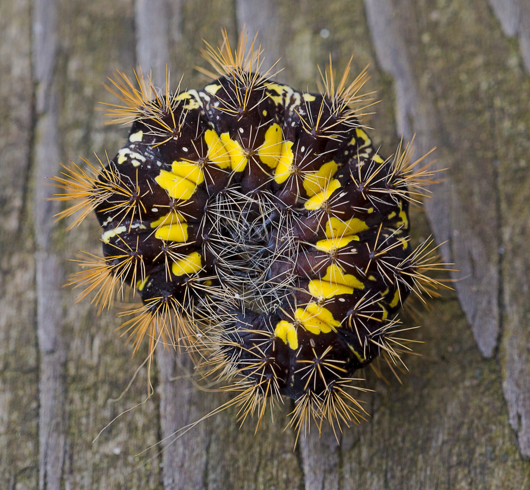 I found this rolled up caterpillar on a bench. I thought it was interesting with the spikes and colors. The caterpillar reminded me of a wreath. Canon 1D MkIV with the Sigma 150mm f/2.8 OS Macro. The caterpillar was in the shade so I used f/8 to get some depth of field for the spikes and tried to shoot straight down with the front of the lens parallel to the caterpillar to get as much in the plane of focus. I ended up with 1/30 of a second exposure at ISO 800 , handheld, so I shot a burst which enabled me to pick the sharpest exposure in the series. I believe it is a Smeared Dagger Moth Caterpillar, a stinging caterpillar. It uses poison filled bristles to defend itself.