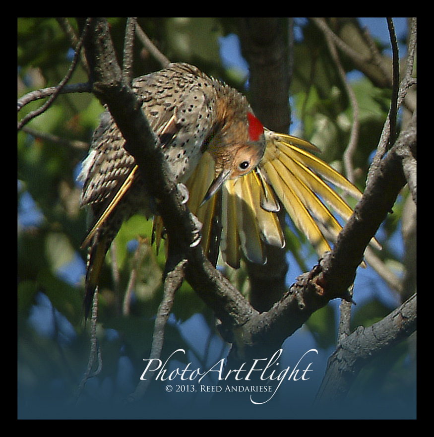 I was condensing files on my external hard disks and came across these files of Norther Flickers. I had found this Northern Flicker preening in a tree at the Celery Farm Natural Area in Allendale NJ. I liked the the Red on the nape of the neck with the yellow on the bottom side of the feathers and the sunlight on the eye and face of the Flicker and skimming across the yellow feathers. I only had time for the one photo before it flew down to a lower tree. So I was glad I got at least one in this light.