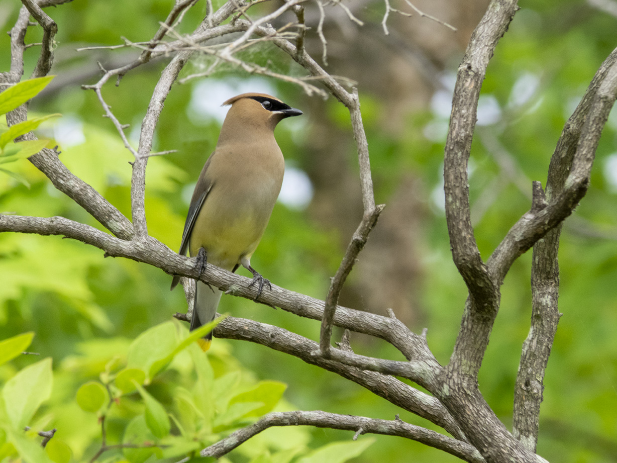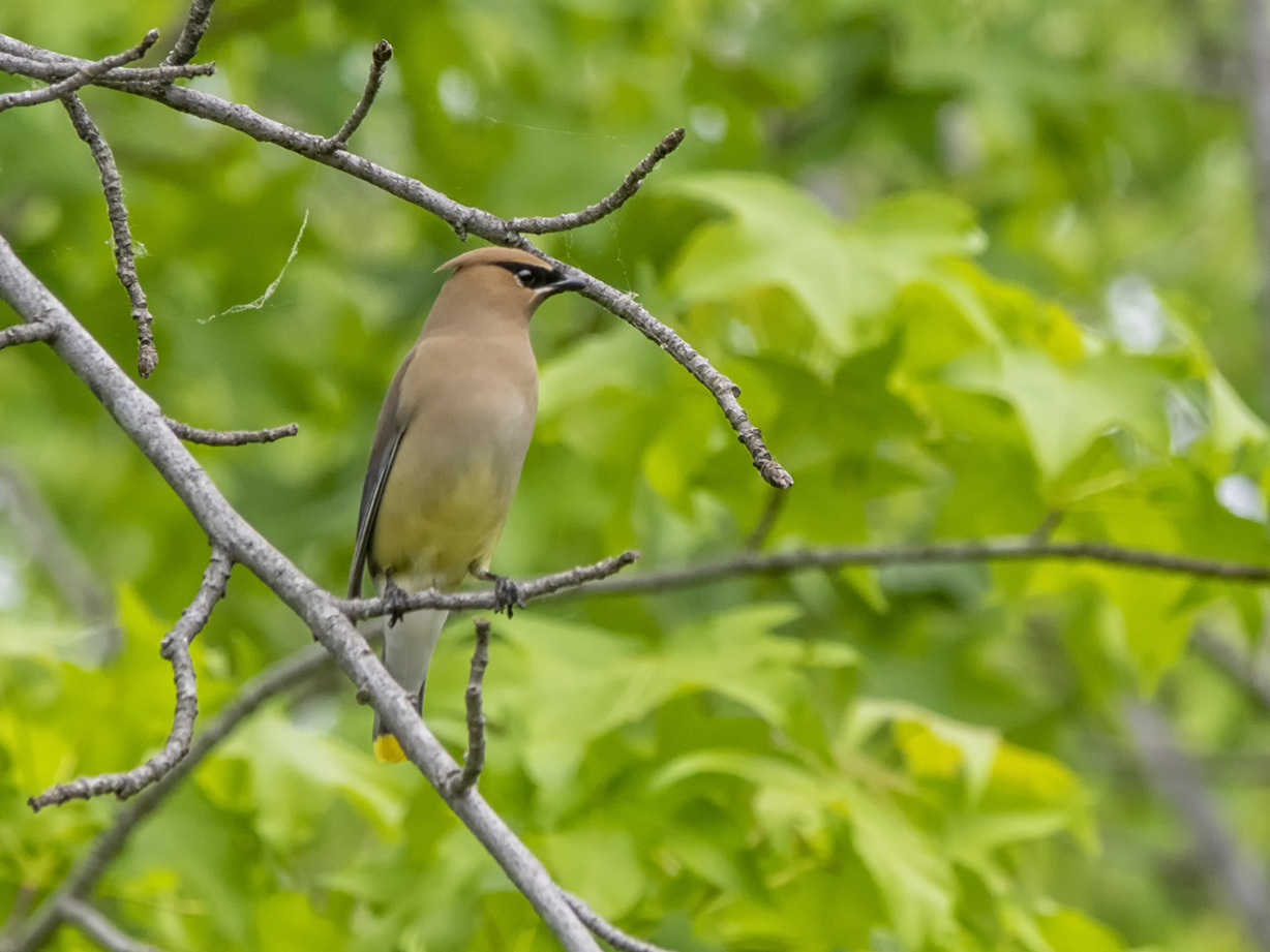 We went for a walk at the Audubon Plainsboro Preserve near our home looking for dragonflies. As we were walking down the path that extends out into Lake McCormick we were surprised to see a pair of Cedar Waxwings. One flew off to a higher branch behind the leaves but the other posed for us giving me an opportunity to get a few fairly close images. I shot a few images than moved a little closer hoping to get some closer shots before it flew off. I was using an Olympus OM-D -Mk1 camera with a Panasonic 100-300mm lens @300mm (Full Frame Camera Equivalent ~ 600mm.)