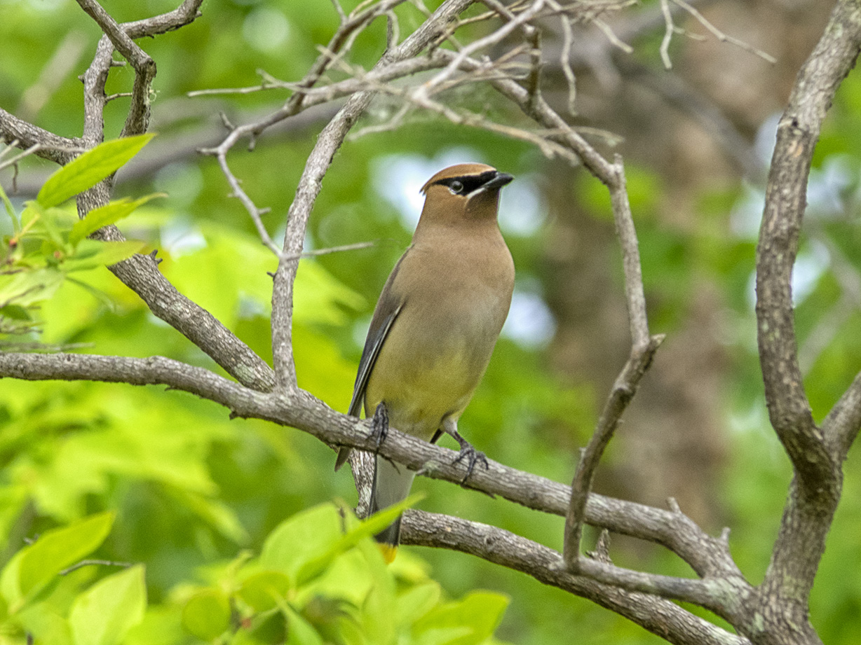 We went for a walk at the Audubon Plainsboro Preserve near our home looking for dragonflies. As we were walking down the path that extends out into Lake McCormick we were surprised to see a pair of Cedar Waxwings. One flew off to a higher branch behind the leaves but the other posed for us giving me an opportunity to get a few fairly close images. I shot a few images than moved a little closer hoping to get some closer shots before it flew off. I was using an Olympus OM-D -Mk1 camera with a Panasonic 100-300mm lens @300mm (Full Frame Camera Equivalent ~ 600mm.)