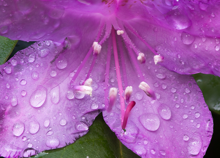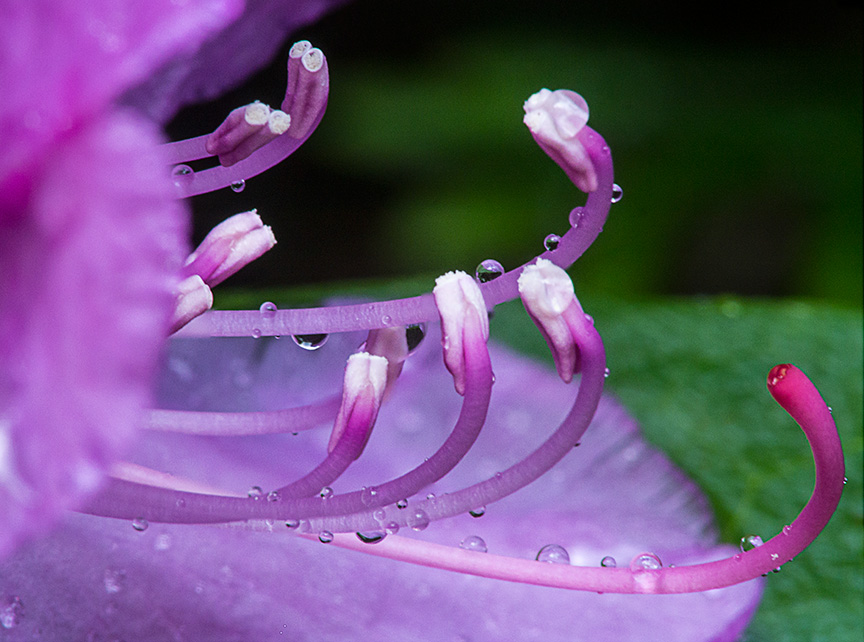 I photographed these closeups of Rhododendron blossoms after a rain. I used a Panasonic GH2 m43 camera body with an old manual focus Canon FD f/4 macro lens mounted with a FD to m43 adapter. It is a great combination for closeups, from flowers to bugs. It gives you a dslr full frame equivalent of a 400mm macro that can go to 2X, but has the depth of field of a 200mm. Lets you get in close to your subject but still have a decent working distance. Also the viewfinder shows you the actual depth of field all the time so you can compose your shots easily. The light was very poor, so I used a tripod and tried various crops and angles. Exposures averaged around 1/20 sec ( the light was very dark) f/8 to f/11, 1/20 sec, ISO 400. Here are a few from the series.