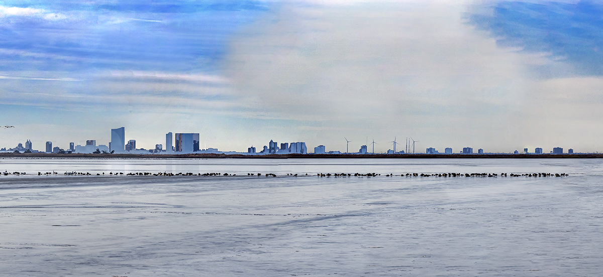 A few days ago we went to the Brigantine Division of the Edwin B. Forsythe National Wildlife Refuge in Oceanville, NJ to see what we could find to photograph. Usually there are large flocks of Snow Geese, Canada Geese & a variety of ducks throughout the Refuge this time of year. Most of the large groups of birds were fairly far out but that gave me the opportunity to do lots of hand-held panoramas. For cameras & lenses I was using a Canon R with a Tamron 150-600mm lens, a Panasonic LX1 pocket camera, an Olympus OM-D 1 with a 7.5mm Fisheye Lens and my iPhone 11 Pro. We also were able to get a few images of different Bald Eagles that were around the Refuge on this trip. On this post I have a few multi-image panoramas of flocks of birds around the Refuge with Atlantic City in the background. The Featured Image is a 29 image pano shot handheld with a 150-600mm lens @ 150mm on a Canon R. This was taken along the Wildlife Drive with the Atlantic City Skyline in the distance. The final image is 90 inches x 16 inches. Very Long Panoramas are not Great to post here because I have to downsize from 75-90 inches to 1200 pixels so I loose a lot of the detail in the images, but at least you can see the view I was trying to show! In future Posts I will be showing panoramas with flocks of birds & Brigantine Landscapes without Atlantic City in the background!