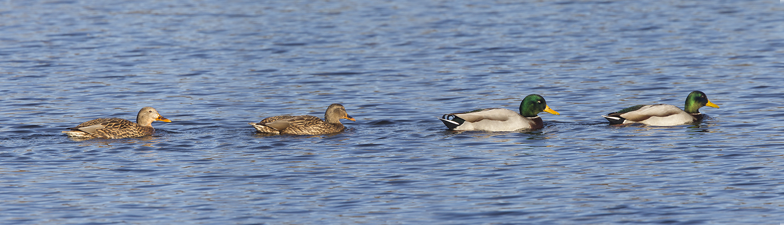 I went to one of the Nature Areas I used to go to frequently to see if there were any subjects to photograph. Usually at this time there are a number of different types of ducks. But this day there were mostly Mallards and way out in the distance were a pair of Dudy Ducks. Being bored, I thought, try some panoramas. So I tried shooting a few series of panoramas to try out assembling them in the new CC Photoshops I downloaded (CC2015.5 & CC2017). I have been a user of Photoshop since version 2 in 1991 and my CS6 version was getting outdated. I resented paying a monthly subscription for the CC version after paying Adobe for all the boxed suites and multiple versions my studio used, but finally had to subcome after all these years. All were images photographed with a 400mm f/4 DO lens on a Canon 1D MkIV. The featured 4 image pano was of 4 Mallards swimming by where I was setup. I had to shoot quickly as they were moving along. After some practice you can make panoramas of moving subjects, just needing a few Quick Masks to help in the blending.