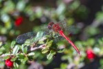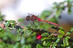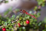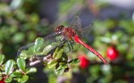 Unexpected visitors to the pond today – 2 Autumn Meadowhawks. Went to get my camera with a 150 macro, but they were very skittish. So I switched to 400mm with extensions tubes and a 1.4X teleconverter. I was trying to get the right combination of background and f/-stop combinations to have an uncluttered background as much as possible. I gave up increased depth of field on most and settled for f/5.6, for a smoother background. I thought it might be interesting to see my progression. I moved vertically & horizontally to try for the best background. With a long lens it does not take much to get a different effect. The dragonfly was also slightly moving around the same plant which also gave me some other choices. It then landed next to a spot with some red berries, so I thought maybe the red berries and the red dragonfly would be interesting. Then I worked some on the other side of the pond with the other dragonfly, but it was much darker, so I was shooting bursts to hopefully get one sharp enough to use. You can see the exif data by the photos.