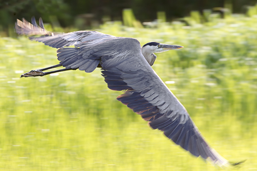 While I was photographing a Great Blue Heron off in the distance, this closer one took off and flew by right in front of me. I was using a slower shutter speed because I had my lens stopped down more than usual because of the distance and wanted more depth of field, so the wingtips of this Heron show some blurred movement. Thought it was still interesting and liked the movement of the wingtips.