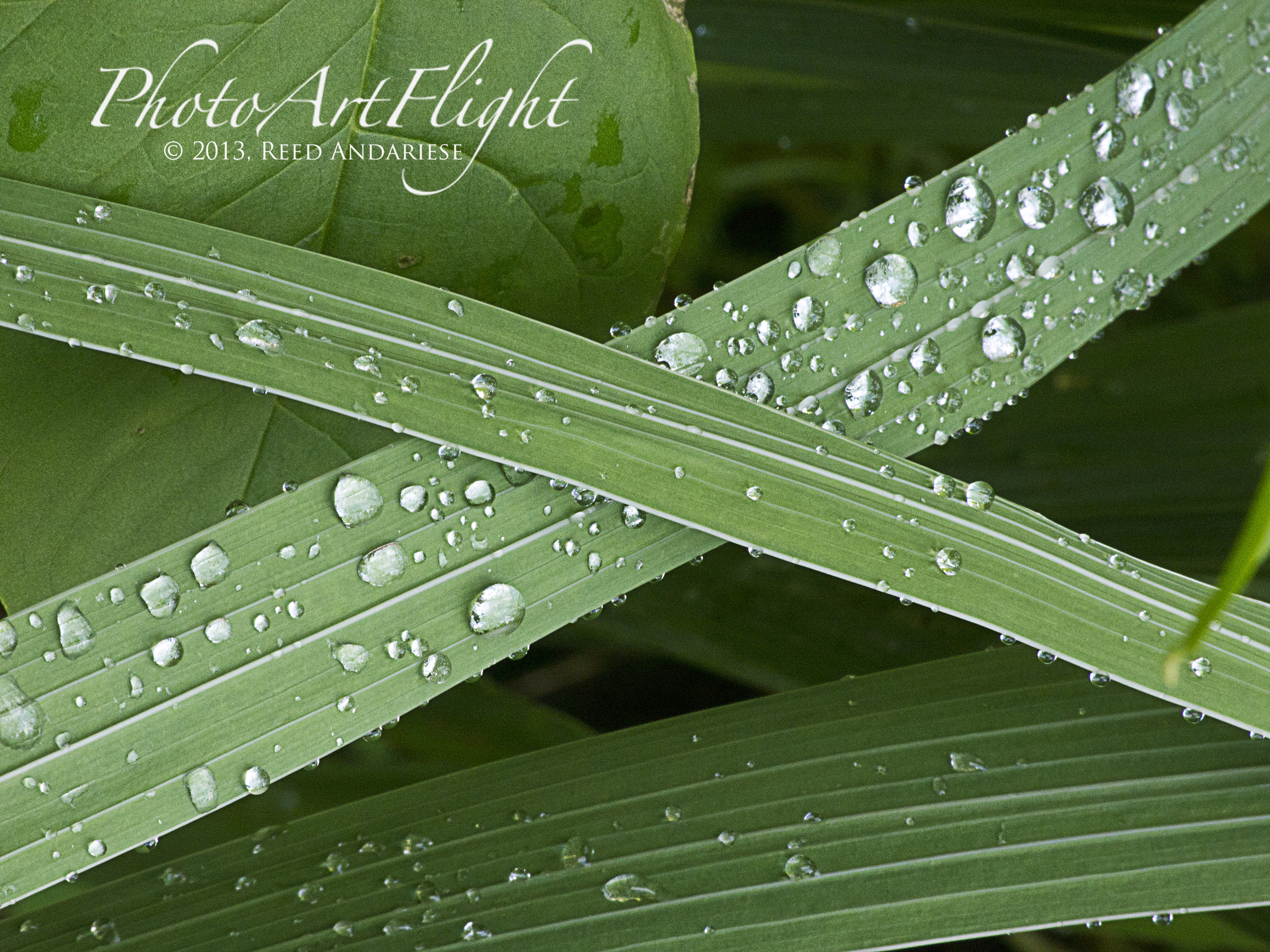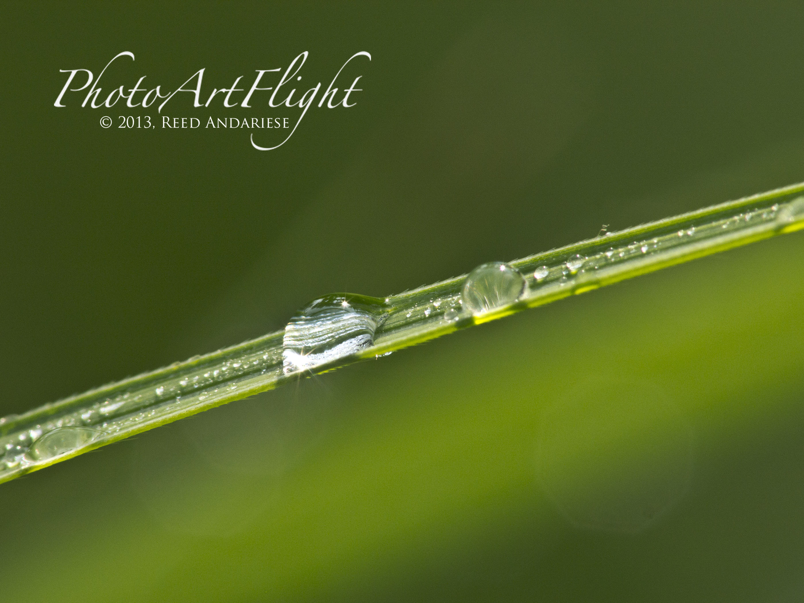 Over the Weekend we had multiple series of rain storms, some with heavy rain. It would rain, then the sun would come out, then it would rain again, multiple times over. I went out in the yard during a sunny session in between, to look for rain drops. I was using a Sigma 150mm f/2.8 macro but did not have a tripod at home. So I tried multiple series of images, for handheld image stacking. Trying to be as steady as possible, I shot multiple series on a variety of groupings of water drops. These range from 3 image stacks up to 19 image stacks per image. Being hand held, it was hard to focus in a series of focus points without moving the frame somewhat. Actually, some I moved quite a bit. The newer versions of Photoshop CC seem to do a really great job of aligning and assembling images. And then filling some areas with content-aware fill to give a finished image. They would have been better if I used a tripod, but overall I am pleased with what I did get.