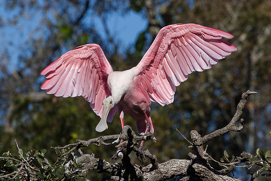 As I was photographing birds on nests at the St. Augustine Alligator Farm, this Roseate Spoonbill flew by overhead. The sun overhead was so bright that it really lit up the wings as it flew by giving a lot of detail in the wings and feathers.