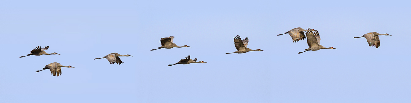 I am still going through Sandhill Crane images that were shot for making panoramas since they were so close to me as I was photographing them. Usually it is a reverse problem where your subjects are too far away as you are photographing them. All images in this post are taken with a 300mm lens on a Canon R. The Featured Image is a 2 horizontal image panorama combined in Photoshop.
