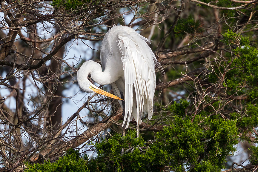 Here is a selection of White Egrets – Snowy and Great Egrets. They were roosting in the trees near the end of the day. It was getting dark and was cloudy, in some ways it was easier to get good exposures of the white birds, without the bright sun, but I had to raise my ISO higher than I usually use. They seemed somewhat territorial when another got too close. It was fun to watch and hear them interacting with each other.