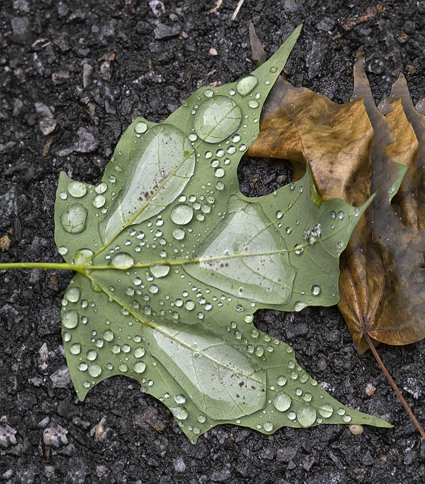 I was looking for water drops after a heavy rain in the yard last year. I saw this leaf with lots of different size droplets and photographed the leaf with a close focusing 300mm f/4 in 2 horizontal images stacked. I used Photoshop to combine the images and then brought out more detail in the Drops. Then went on to photograph the water drops on leaves. I also used a High Pass sharpening technique on a separate layer in Photoshop.