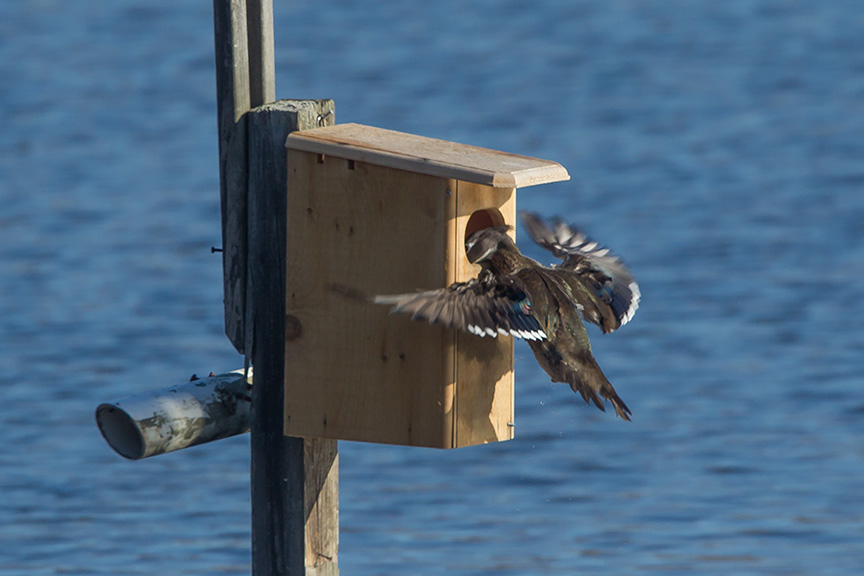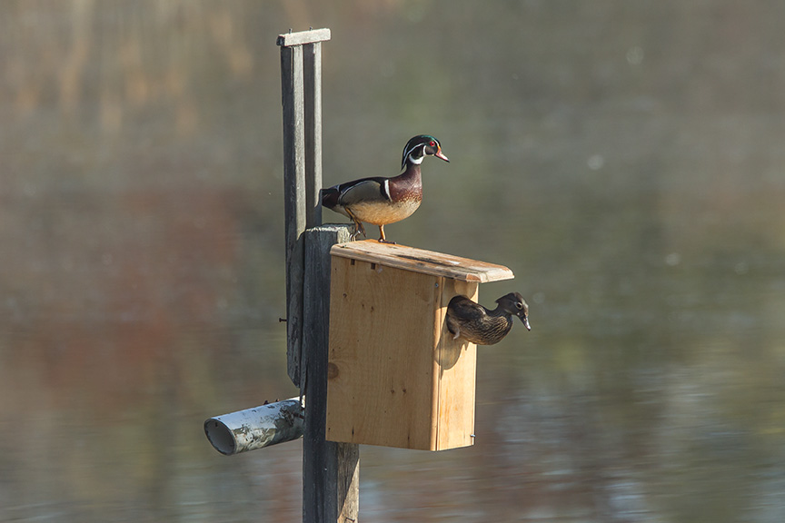 This pair of Wood ducks were checking out this Wood Duck Box at the local Nature Preserve. We noticed the female was really trying to go in, but having great difficulty getting in the box. She tried multiple times before swimming off. We noticed after watching that she was missing one foot which probably made it difficult to get in the box. She tried flying in and almost made it then fell away from the opening. We were thinking a Snapping Turtle probably got her foot as they were swimming around. The pair swam off and we are not sure if she tried again at a later time.