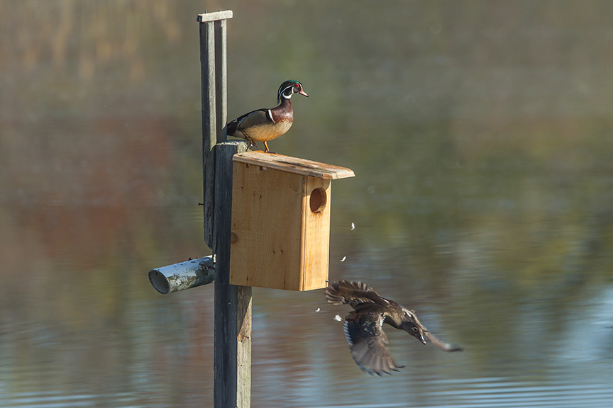 Over the weeks I have seen many Wood Ducks check out this Wood Duck Box. It seems each pair checks it out and moves on. Today this pair checked it out. The female flew in and again flew out. Then they both swam away. I got a series of exiting, but liked the featured one above the best.